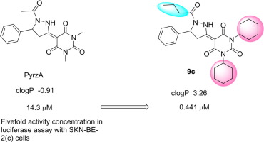 低酸素状態を感知して、防御機構を発動する分子メカニズムに関する基礎研究が盛んに実施されると同時に、多くのHIF活性化剤が創出されてきました。弊社の技術顧問である川口と辻田は東北大学大学院医学系研究科在籍時に、高感度にHIFの活性化状態を可視化できるモニター細胞を作り出し、本邦の公的化合物ライブラリーから多くのHIF活性化剤を見出しました。化合物の構造を精査すると、そのほとんどがHIFの分解に関与するプロリル水酸化酵素(PHD)の補因子である2-オキソグルタル酸(2-OG)の構造を保持していました。見出したヒット化合物のほとんどがすでに発表されているHIF活性化剤に類似したものでしたが、その中に、2-OG骨格を保持しない5-(1-acetyl-5-phenylpyrazolidin-3-ylidene)-1,3-dimethylbarbituric